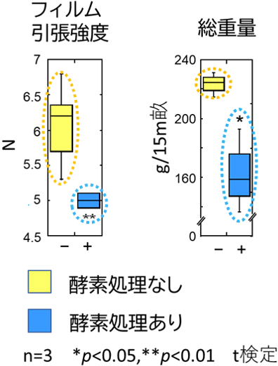 白色が酵素処理あり(フィルム強度が下がり破断)で、黒色は酵素処理なし。